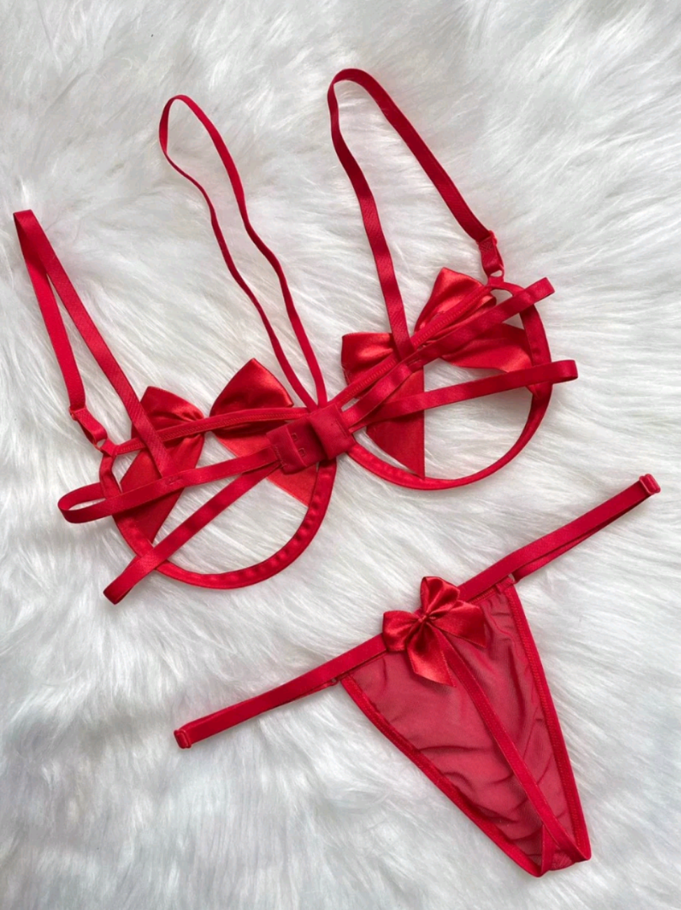 Conjunto sensual, sutiã com aro e laço, calcinha fio dental em tule